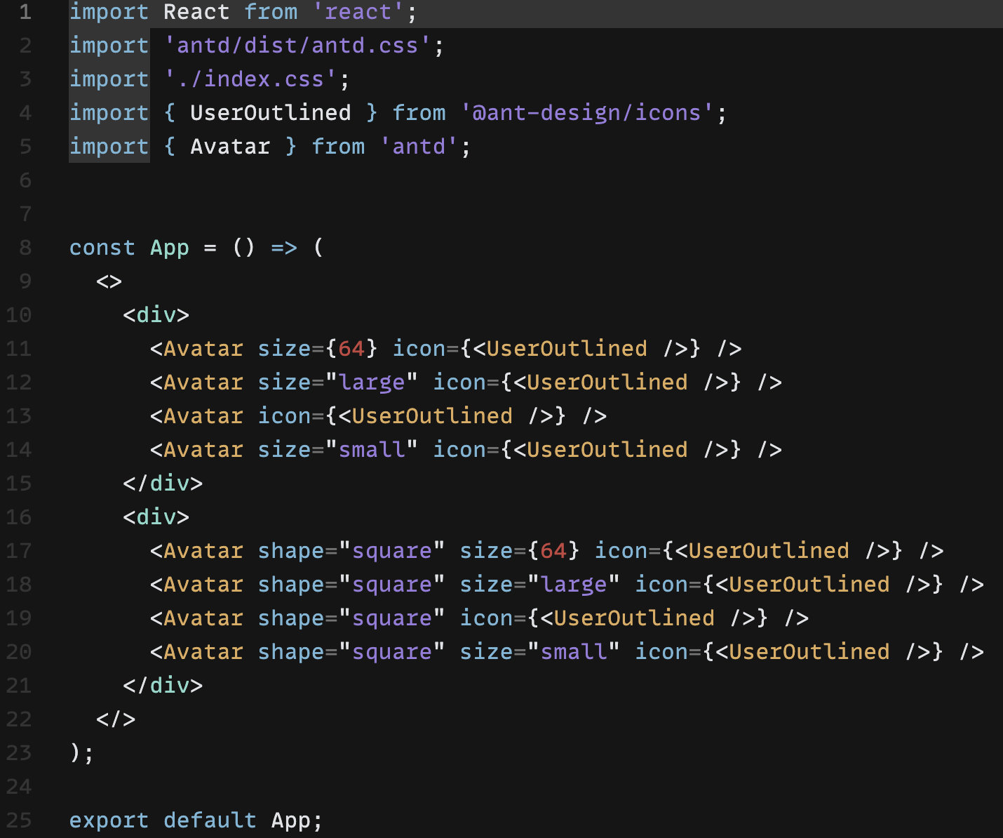 ant design에서 avatar를 구성할 때 css보다 역할에 대해 중점을 두어 <Avatar>라는 코드를 import하고, 삽입하고 있습니다.