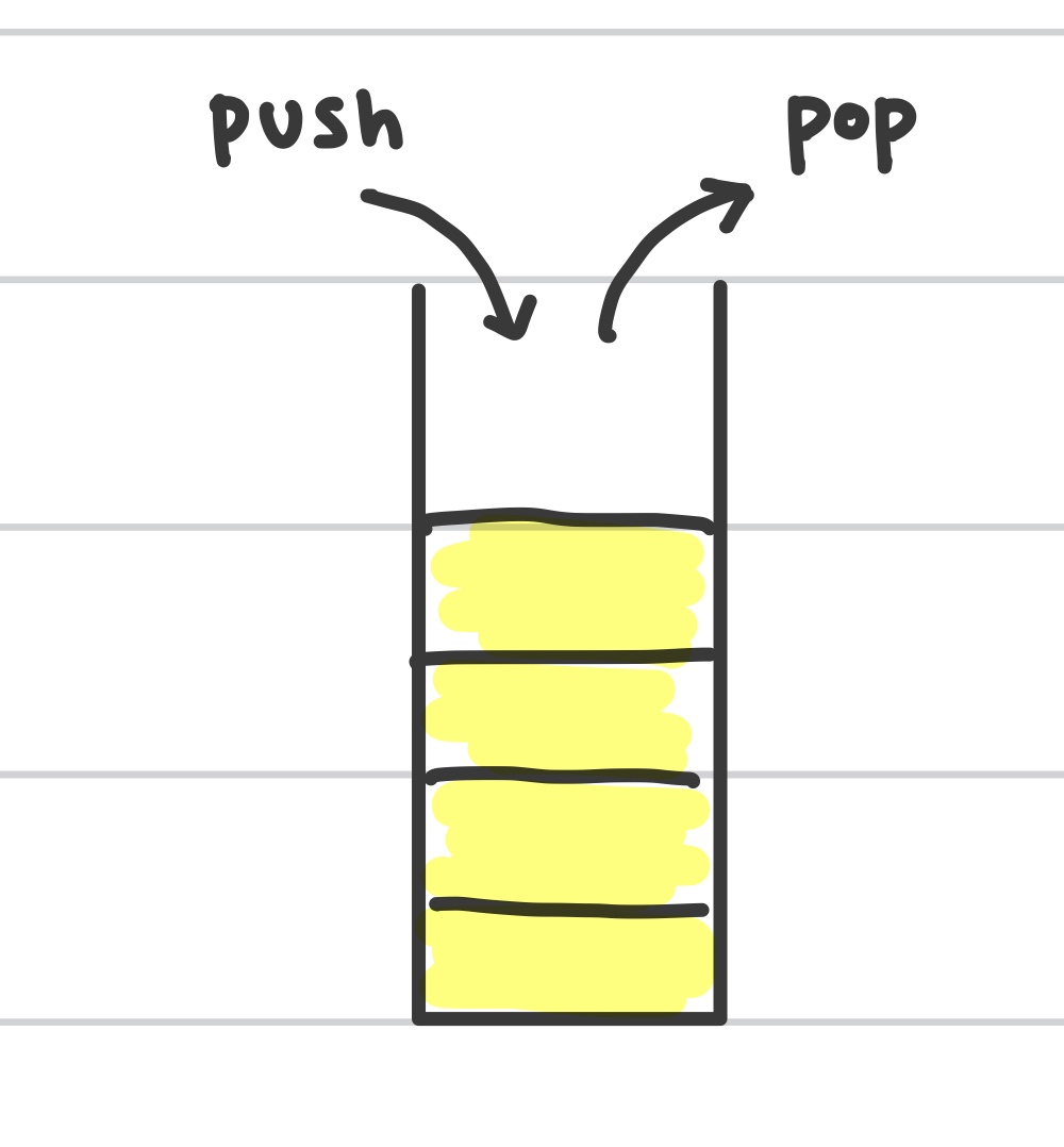 LIFO(Last In First Out)이라고 하며, 가장 마지막에 들어간 원소가 가장 처음으로 나오는 구조이다.