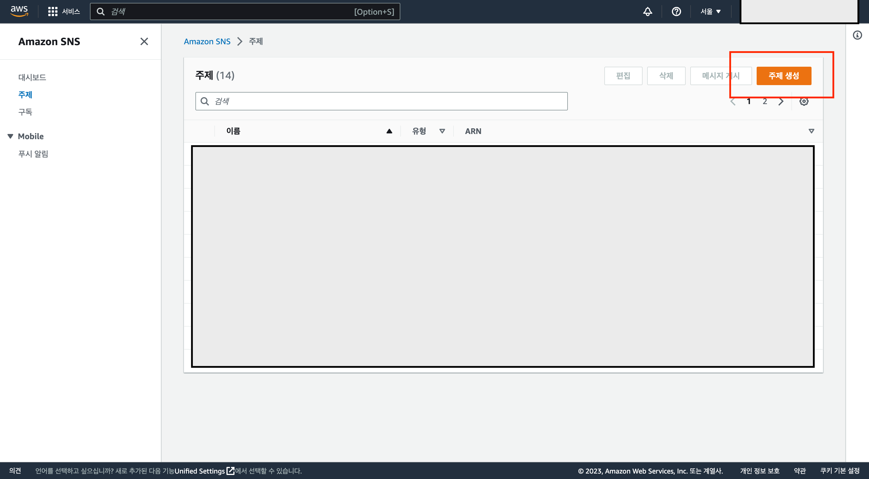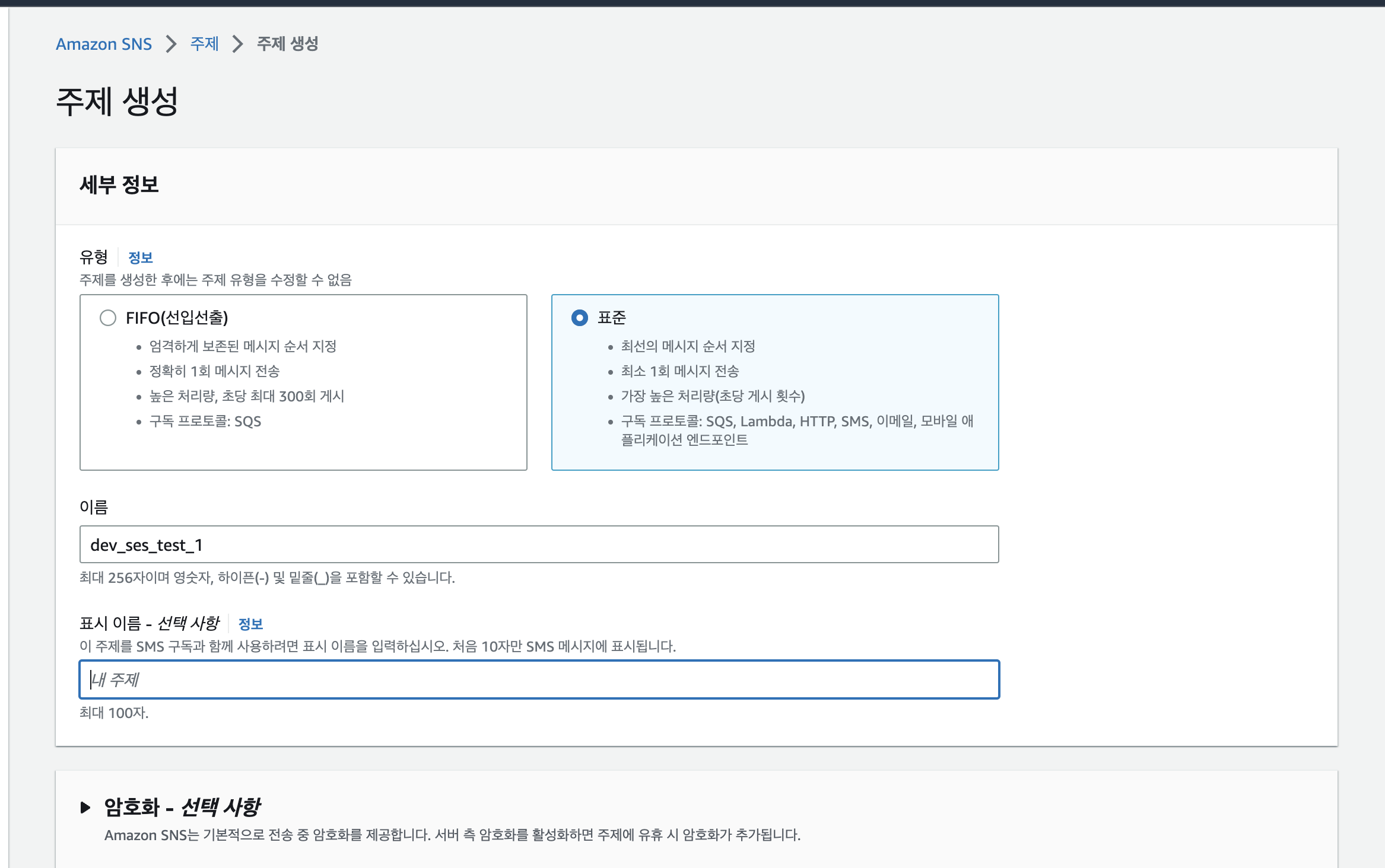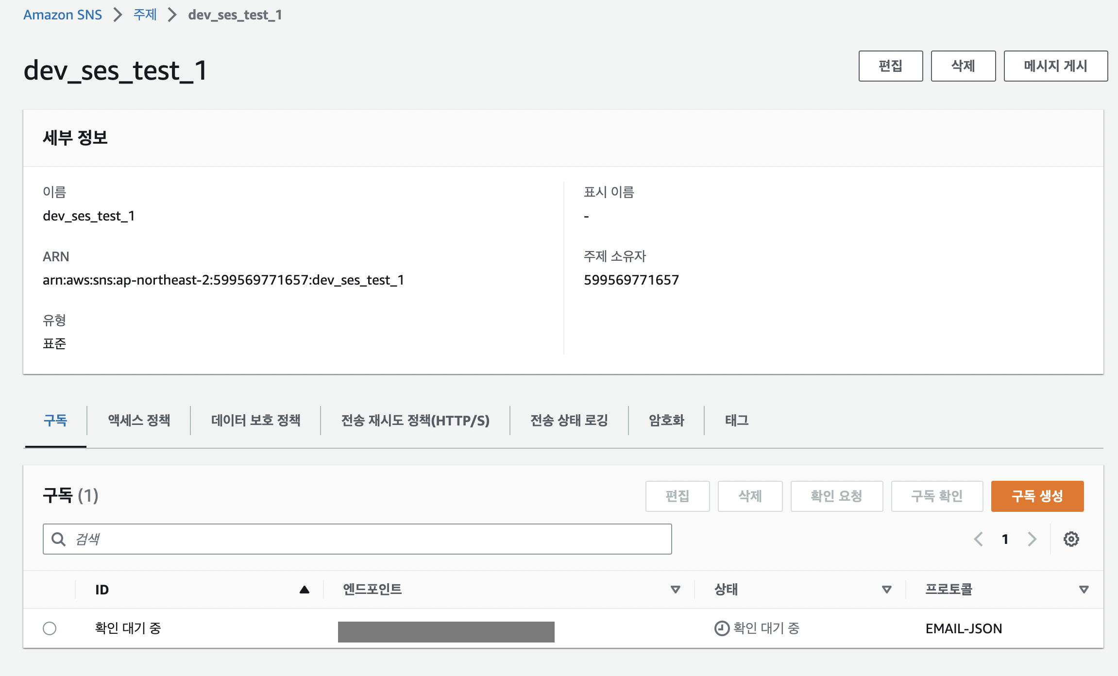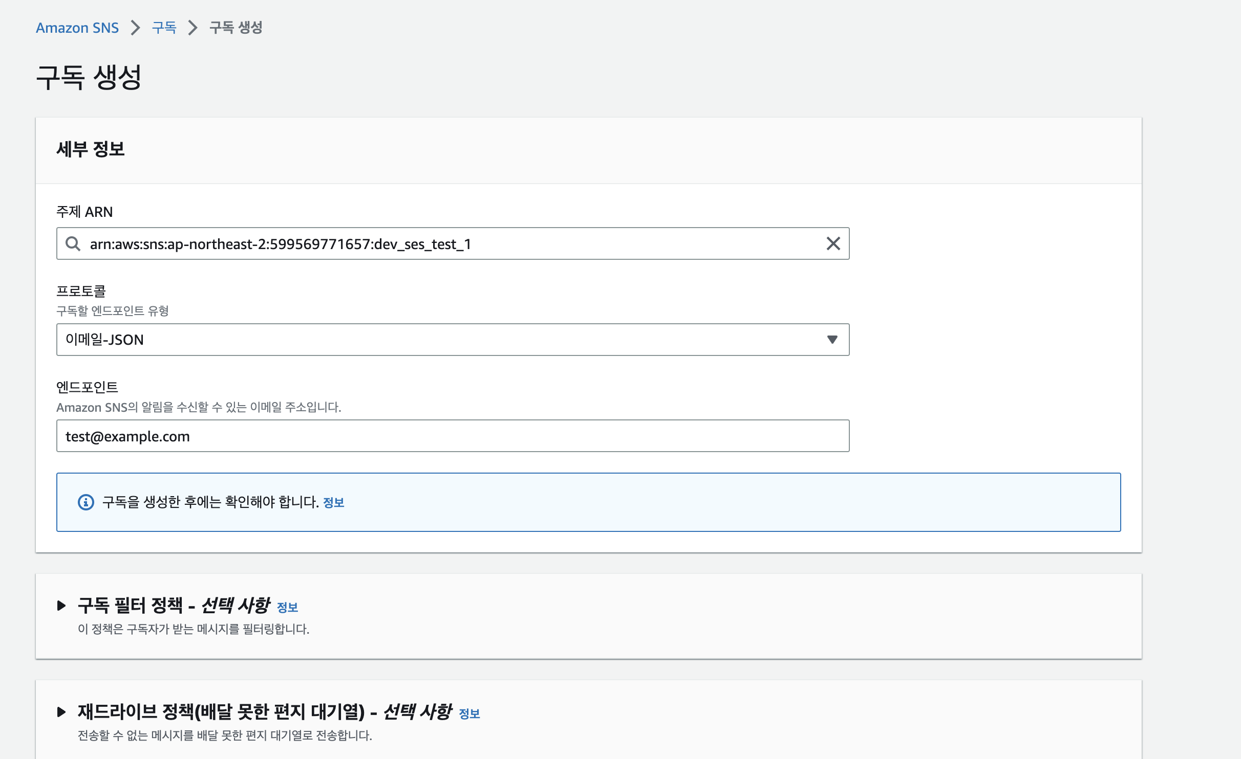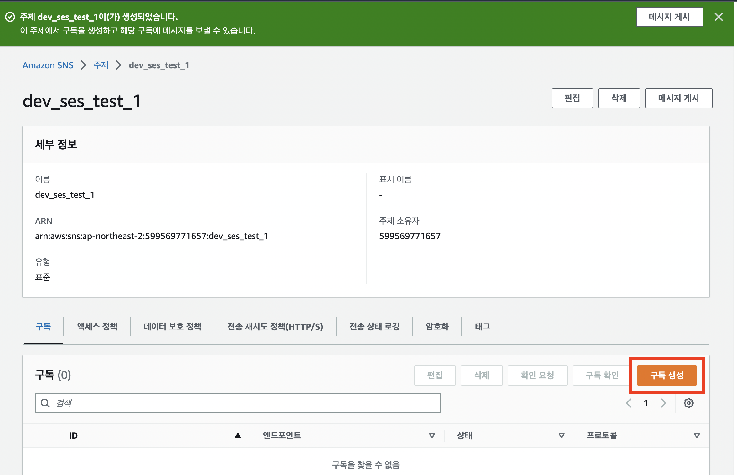 - sns 주제에서 새로 생성한 amazone sns 주제 선택