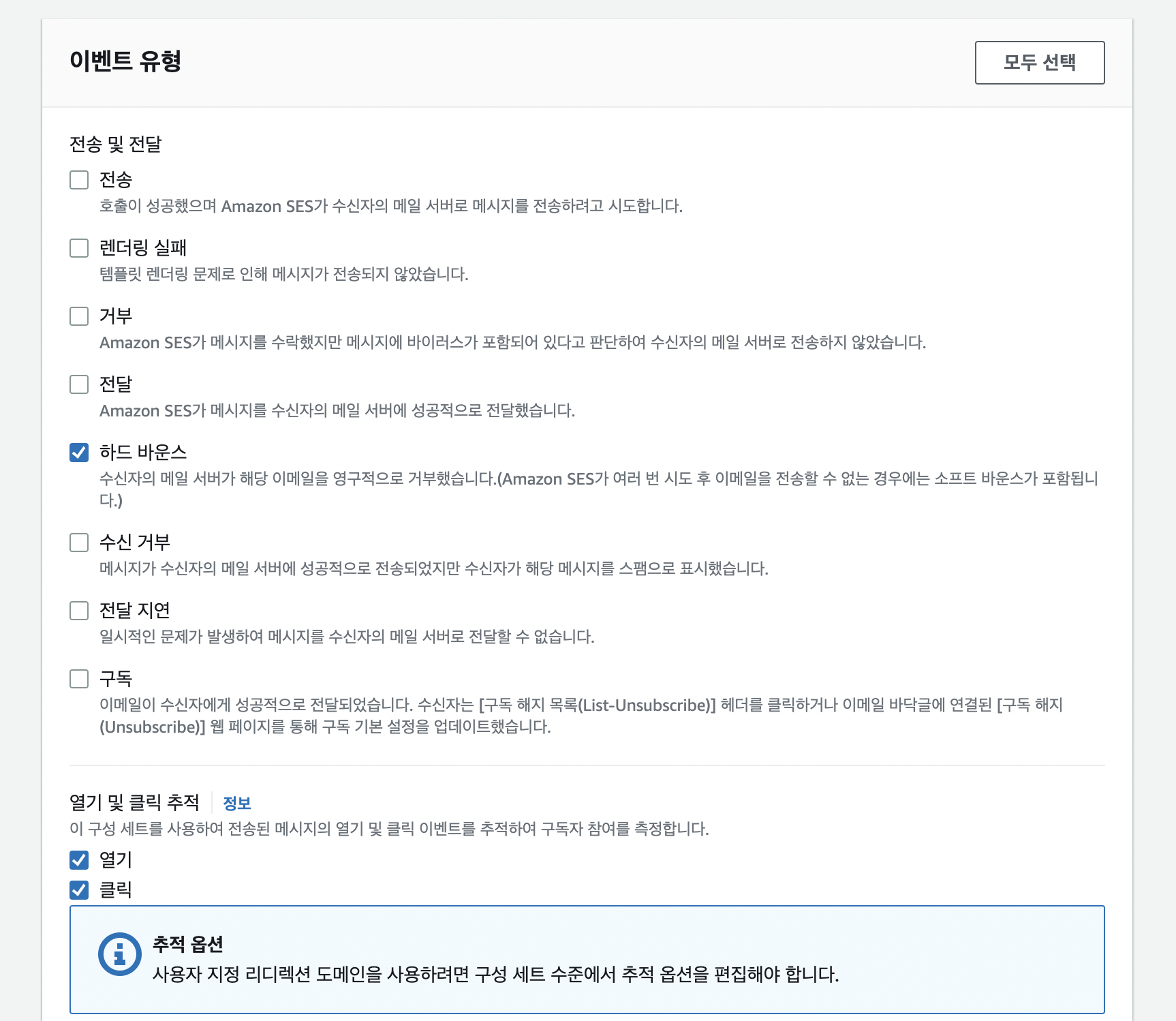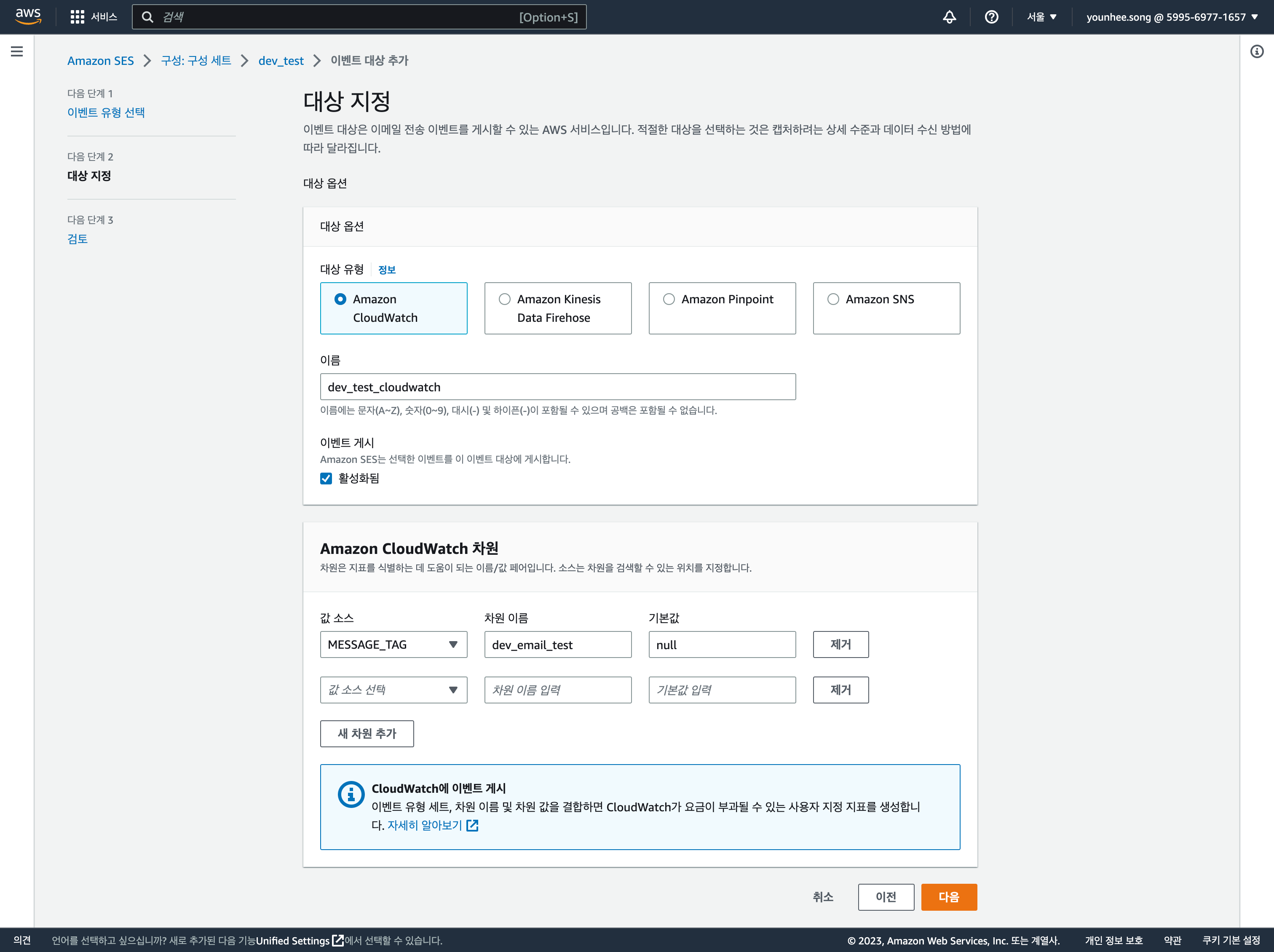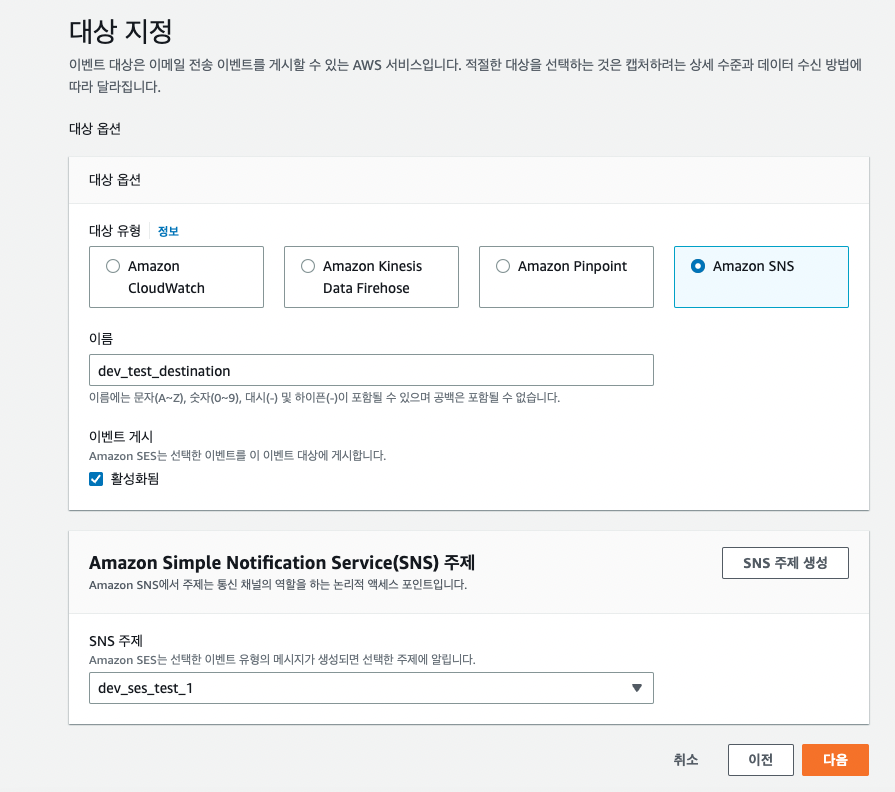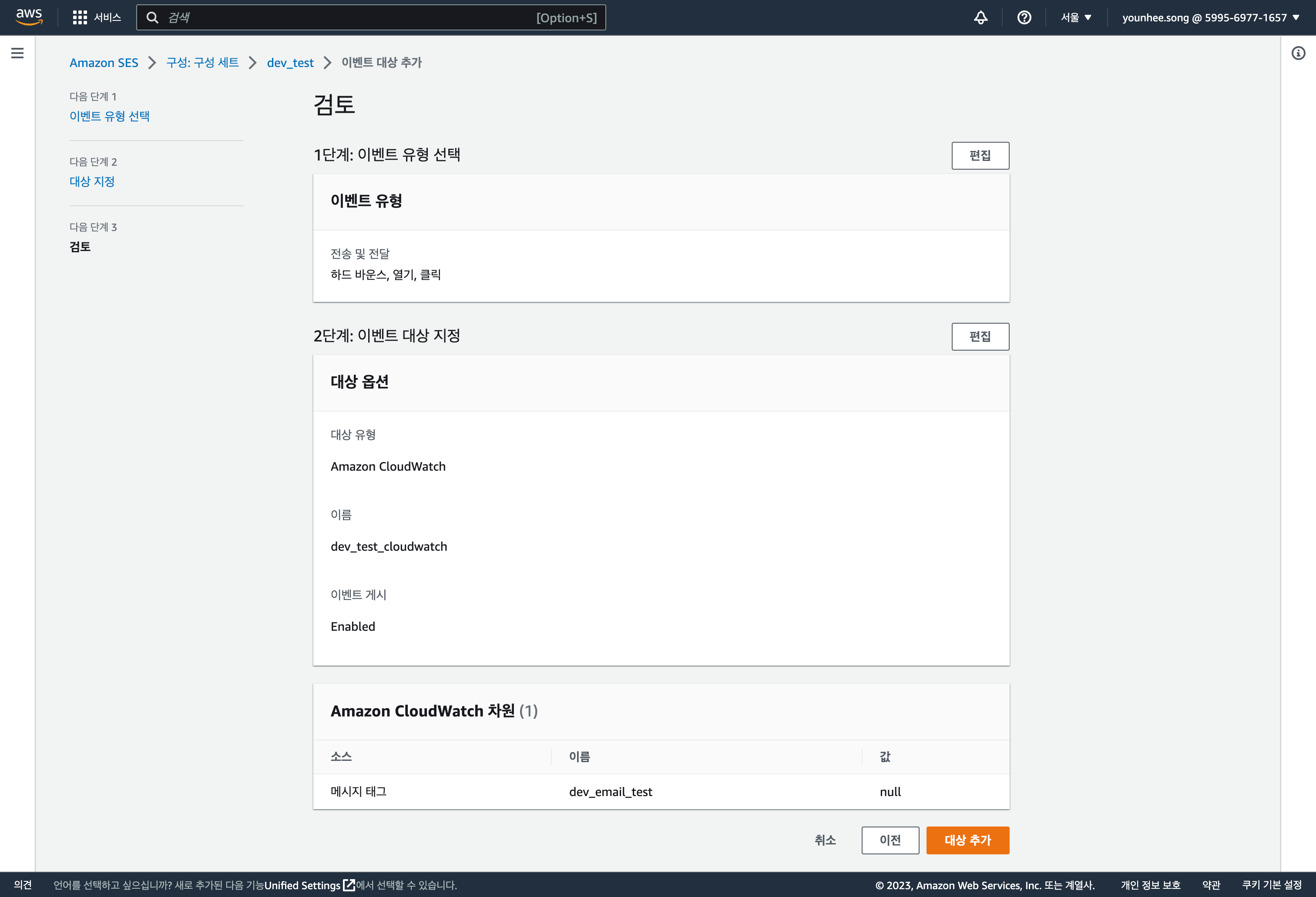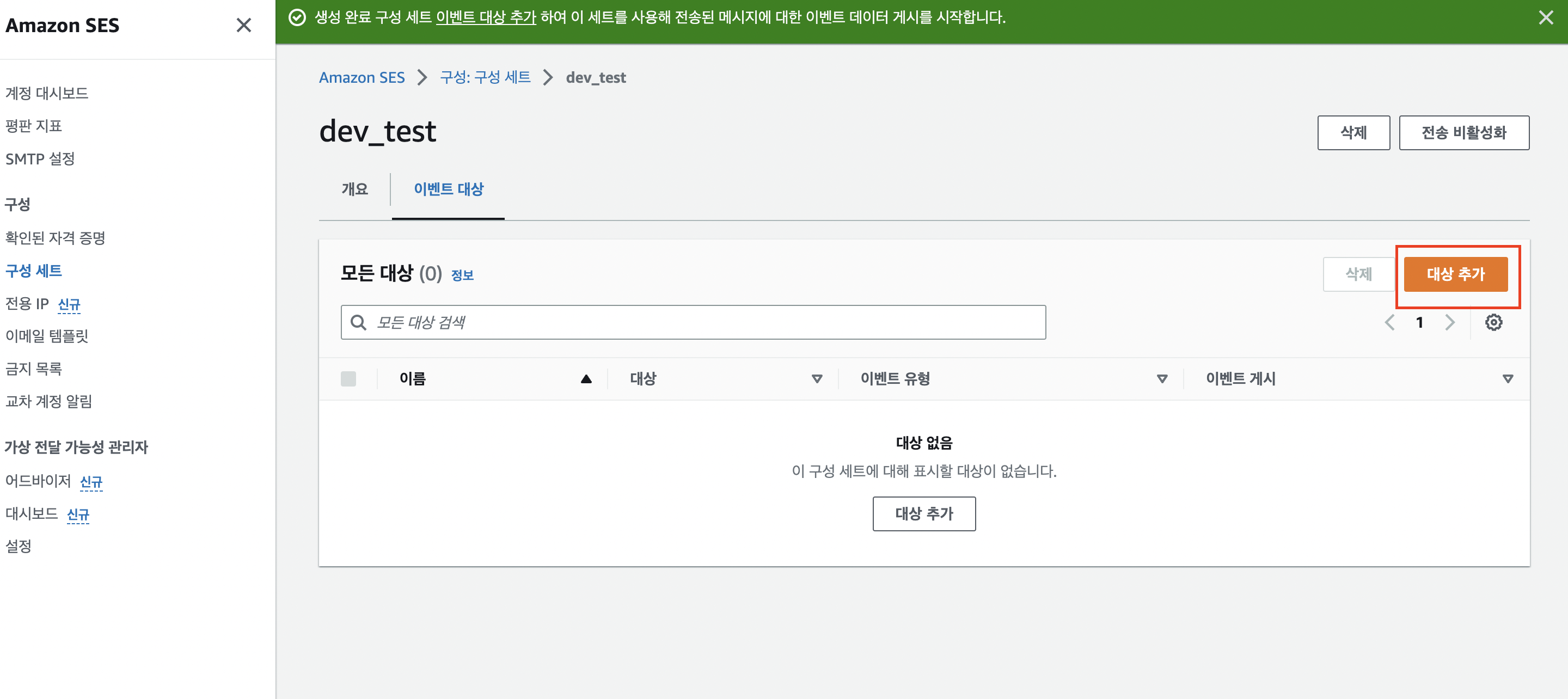 AWS SES console 창으로 이동 -> 구성 세트 -> 새로 만든 구성 클릭 -> 이벤트 대상 탭 ->“대상 추가” 선택