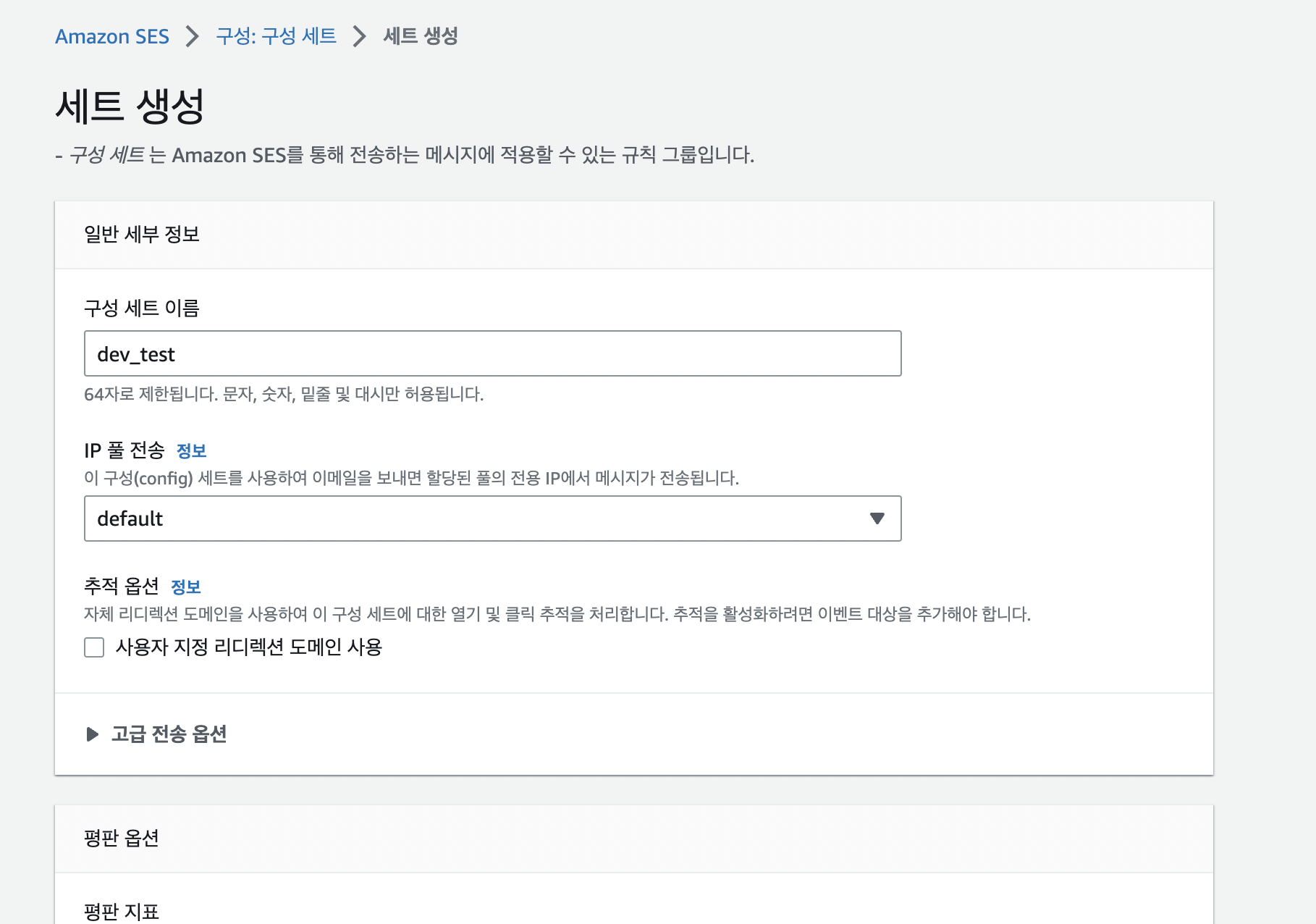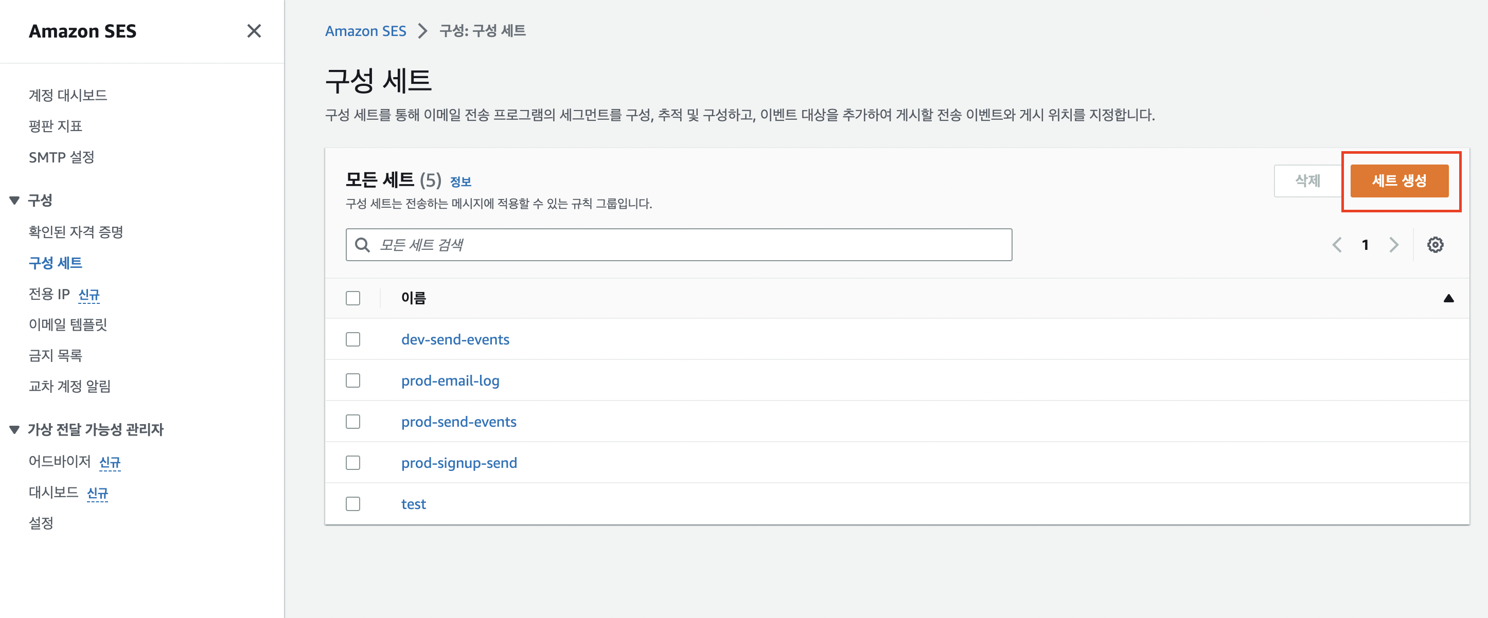 (1) amazone ses 콘솔 열기 구성/구성세트 선택 -> 세트 생성