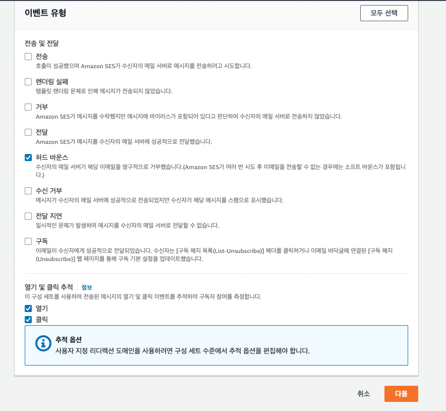 (2) 이벤트 유형 : 하드 바운스, 오픈 및 클릭 선택 → 다음 클릭