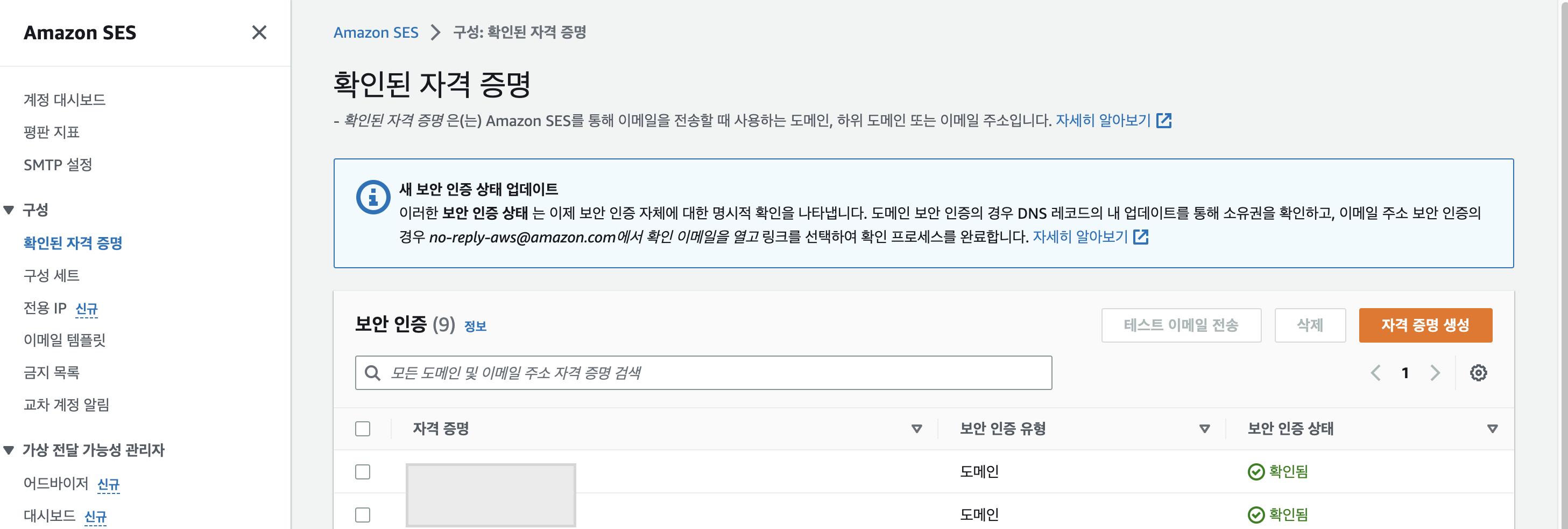 (2) 구성 / 확인된 자격증명 선택 → 인증된 도메인 중에 하나 선택 → 테스트 이메일 전송 선택