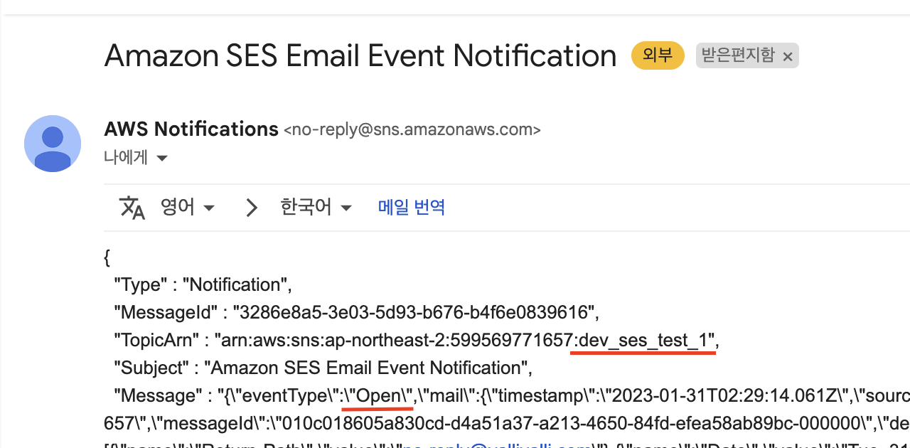 - 테스트 메일을 확인 후, sns 주제 구독의 엔드포인트로 설정된 이메일에 sns 알림이 간다.